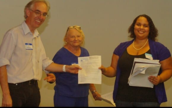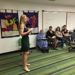Eva Posner, Communications Coordinator SDCDP [Photo: Ramla Sahid]Eva Posner, Communications Coordinator for the San Diego County Democratic Party, gave us details about the protests planned against ALEC on July 22, 2015. [Jackson also helped with her presentation.]