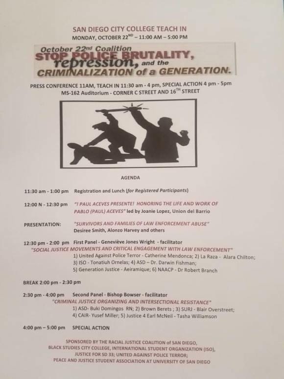 NOONTeach-in at San Diego City College, 1313 Park Boulevard 12-4As part of the Racial Justice Coalition, we invite you to join us as we host a teach in honor of stolen lives as we fight to abolish police brutality in communities of color. We will have several speakers who will be educating us on how to get involved and updates on local cases such as Earl McNeil.Facebook Event:Schedule below.